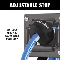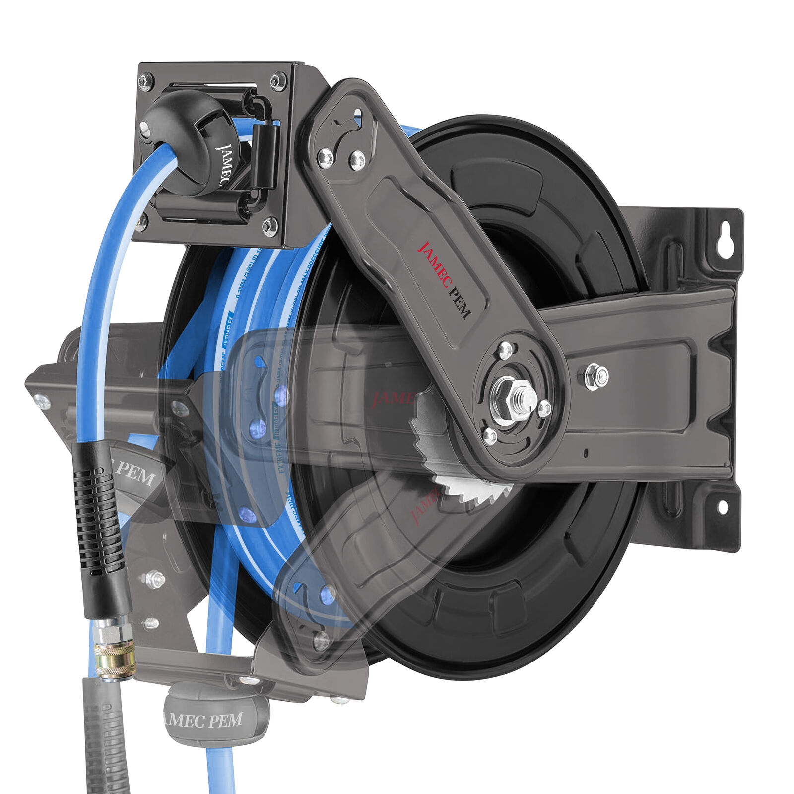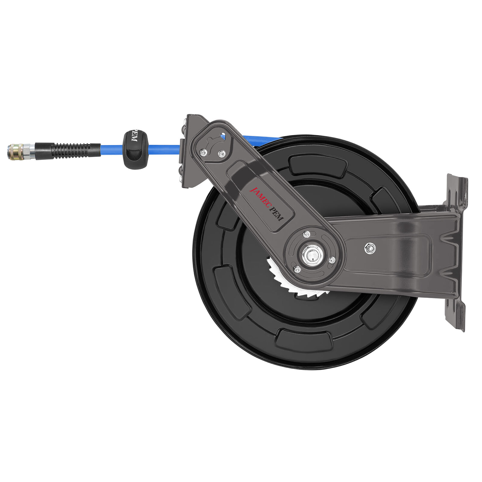 The Jamec Pem Heavy-Duty Retractable Steel Hose Reel delivers serious performance with a premium 3/8" Extreme Ultraflex hose that stays supple in the cold, won’t kink in the heat, and handles whatever your workday throws at it.