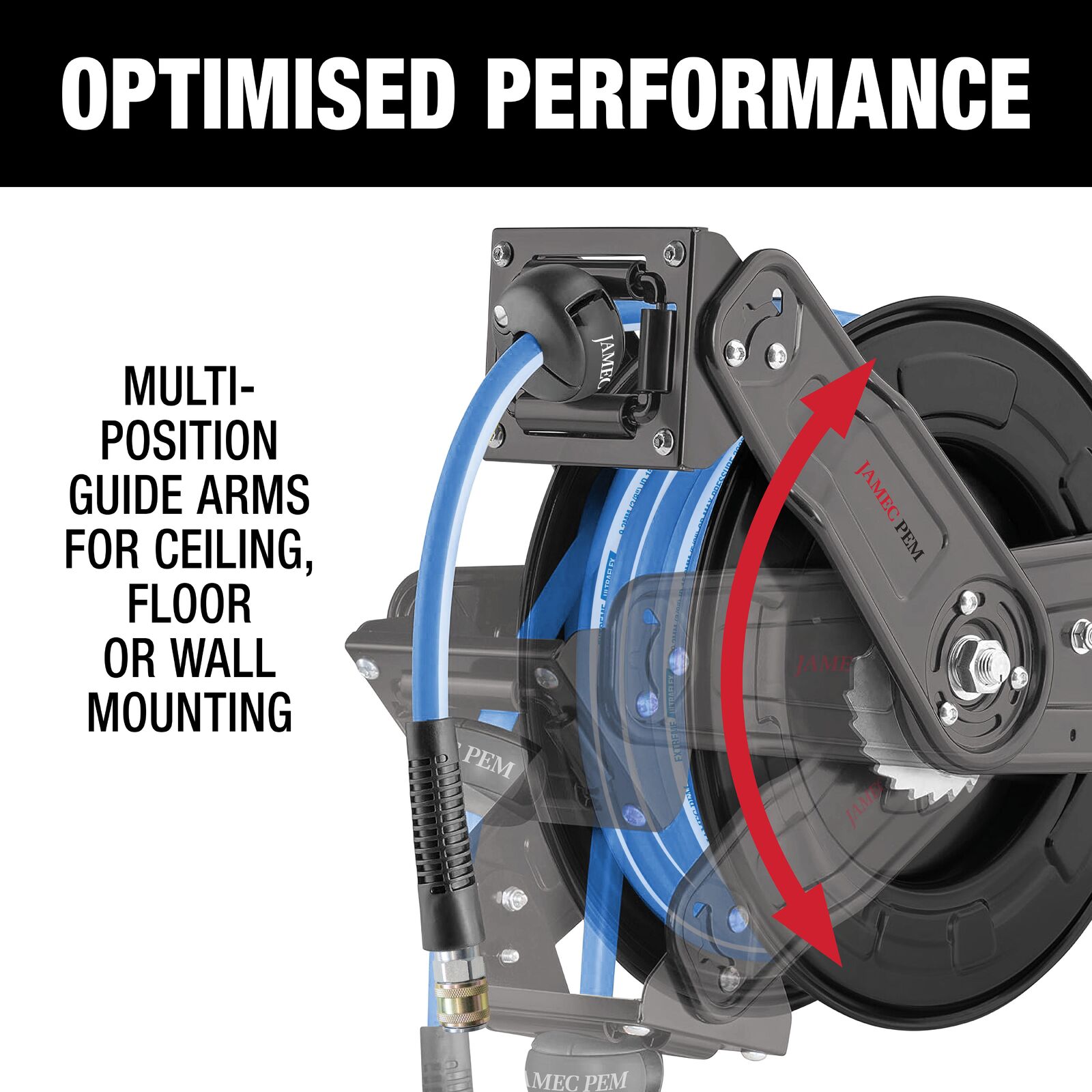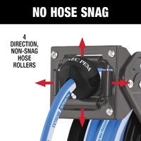 - Versatile mounting & protection: A multi-position guide arm allows for ceiling, floor or wall mounting, while non-snag rollers reduce hose wear and extend the reel’s lifespan.